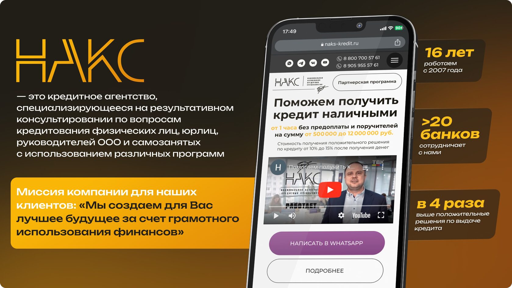 Для корректной реализации рассылок потребовалось сделать маркетинговую упаковку ключёвых продающих материалов. Старый формат с начала нашей работы уже не соответствовал новому заданному стандарту подачи контента: мы утвердили новый стиль визуализации, и он стал очень свежим, в меру креативным и одновременно продающим. Потенциальный клиент получал в мессенджер или по e-mail адаптированный под экран носителя маркетинг-кит и коммерческое предложение, где с небольшим объёмом текста и акцентированным визуалом видео все выгоды и мог быстрее принять решение о сотрудничестве с кредитным брокером.